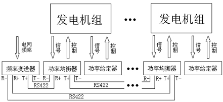 頻率變送器測量到電網(wǎng)頻率不在其設(shè)置的頻率上下限范圍內(nèi),如頻率低于下限,則向所有功率均衡器發(fā)送增速控制命令,功率均衡器按頻率變送器設(shè)置的繼電器吸合、釋放時(shí)間對本儀表的增速繼電器進(jìn)行動(dòng)作,調(diào)節(jié)電網(wǎng)頻率。如果高于上限,則發(fā)送減速控制命令。